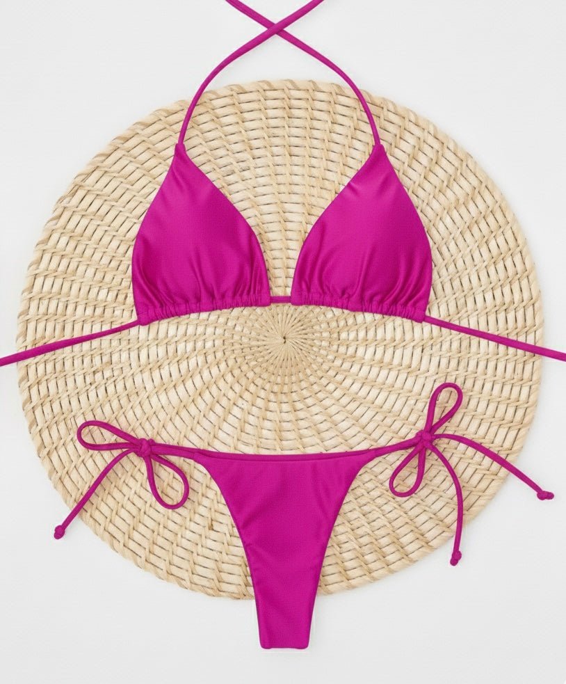 El bikini perfecto para tus días de bronceo. Doblemente forrado en tela. Incluye almohadillas removibles. Panty en hilo. Talla única ajustable.