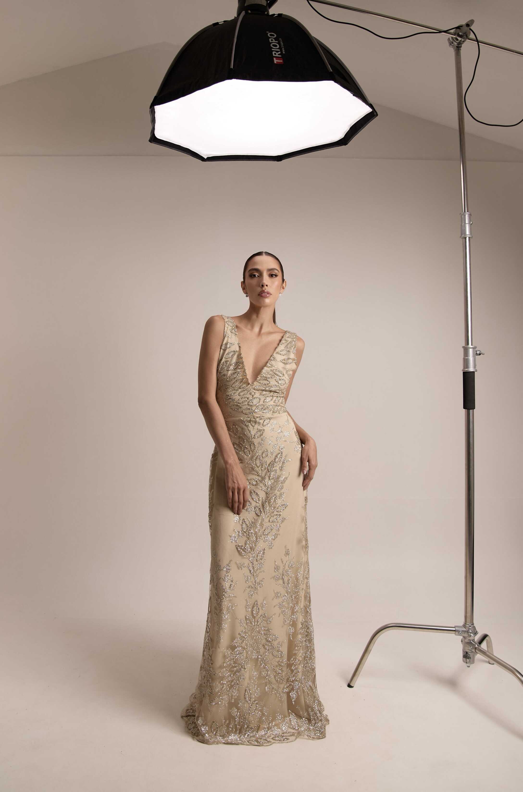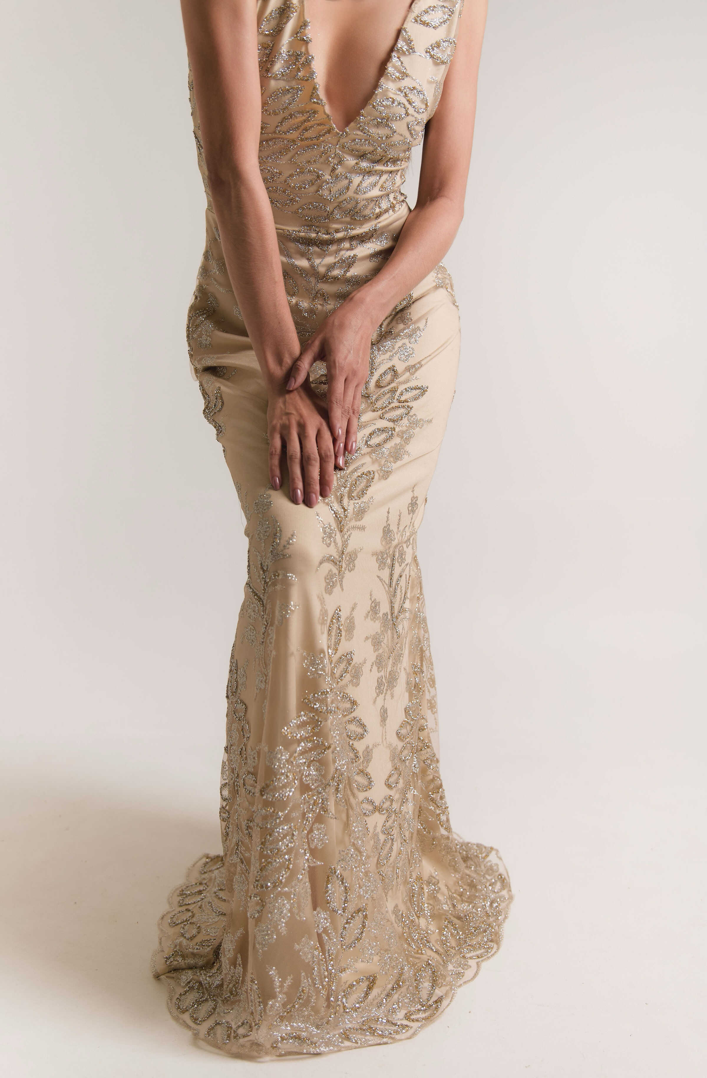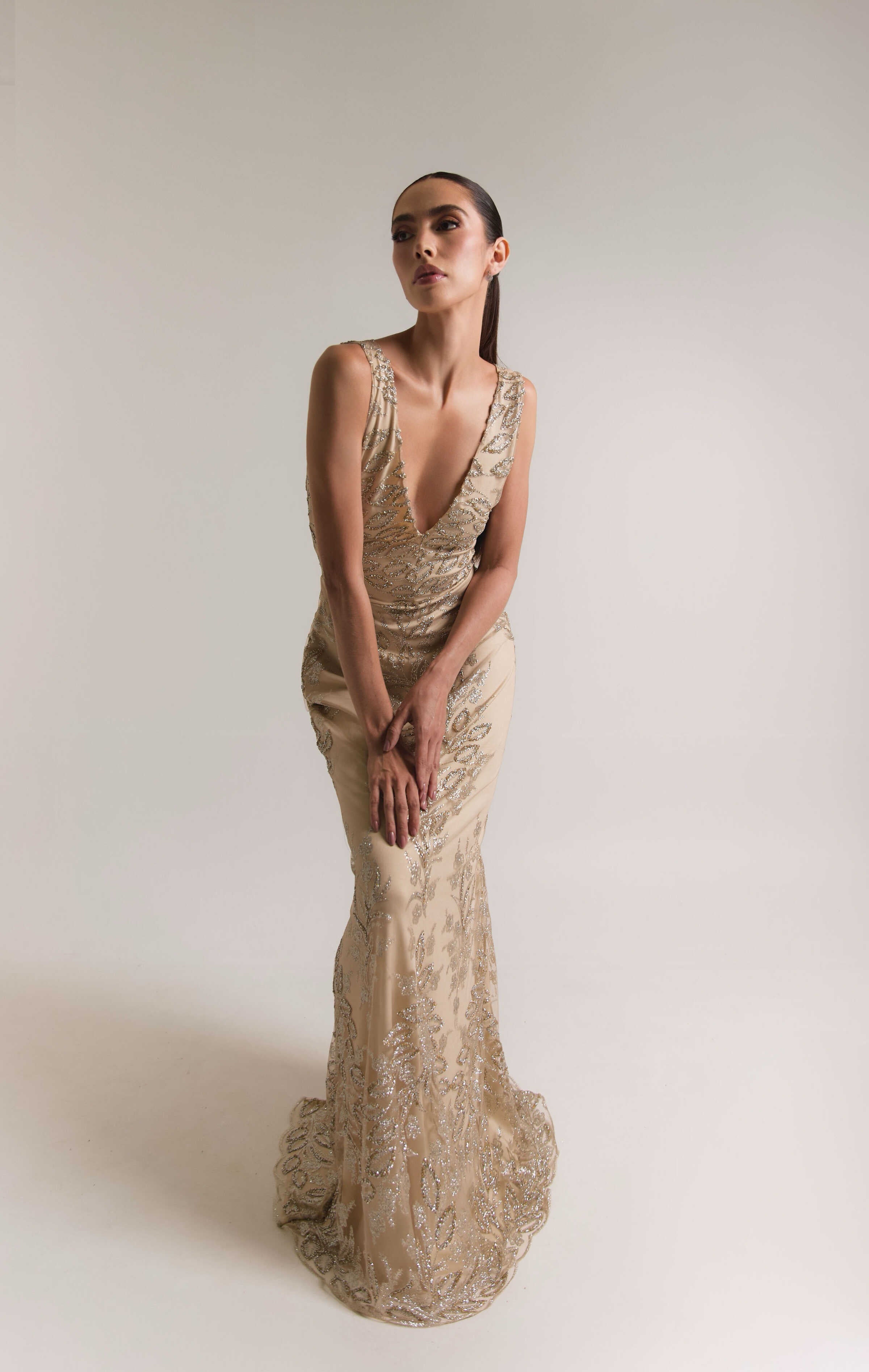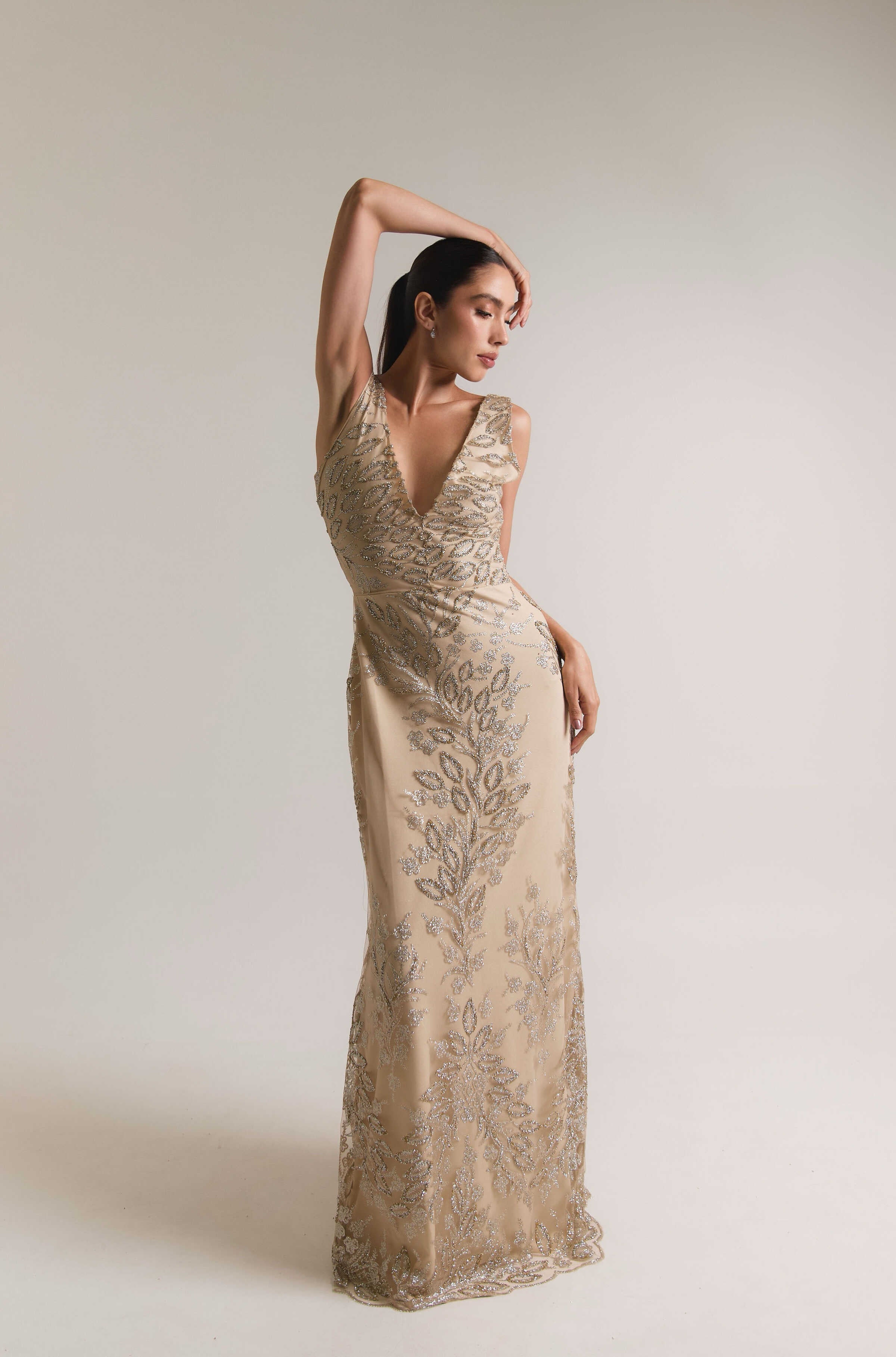 Un diseño que captura la luz en cada movimiento. Este vestido largo en tono nude dorado está bordado completamente con pedrería plateada en patrones orgánicos que estilizan la figura y acentúan la silueta de forma natural. Su escote profundo en V aporta sensualidad con elegancia, mientras que el fit sutilmente ajustado crea una caída limpia y sofisticada.