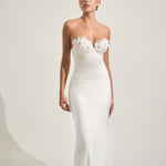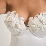 Cada detalle ha sido cuidadosamente pensado: los pétalos de flores en encaje, elaborados y pegados a mano por artesanas expertas, aportan textura y un encanto único. El enterizo, confeccionado con textiles inteligentes, además de una horma impecable que realza y estiliza la figura.