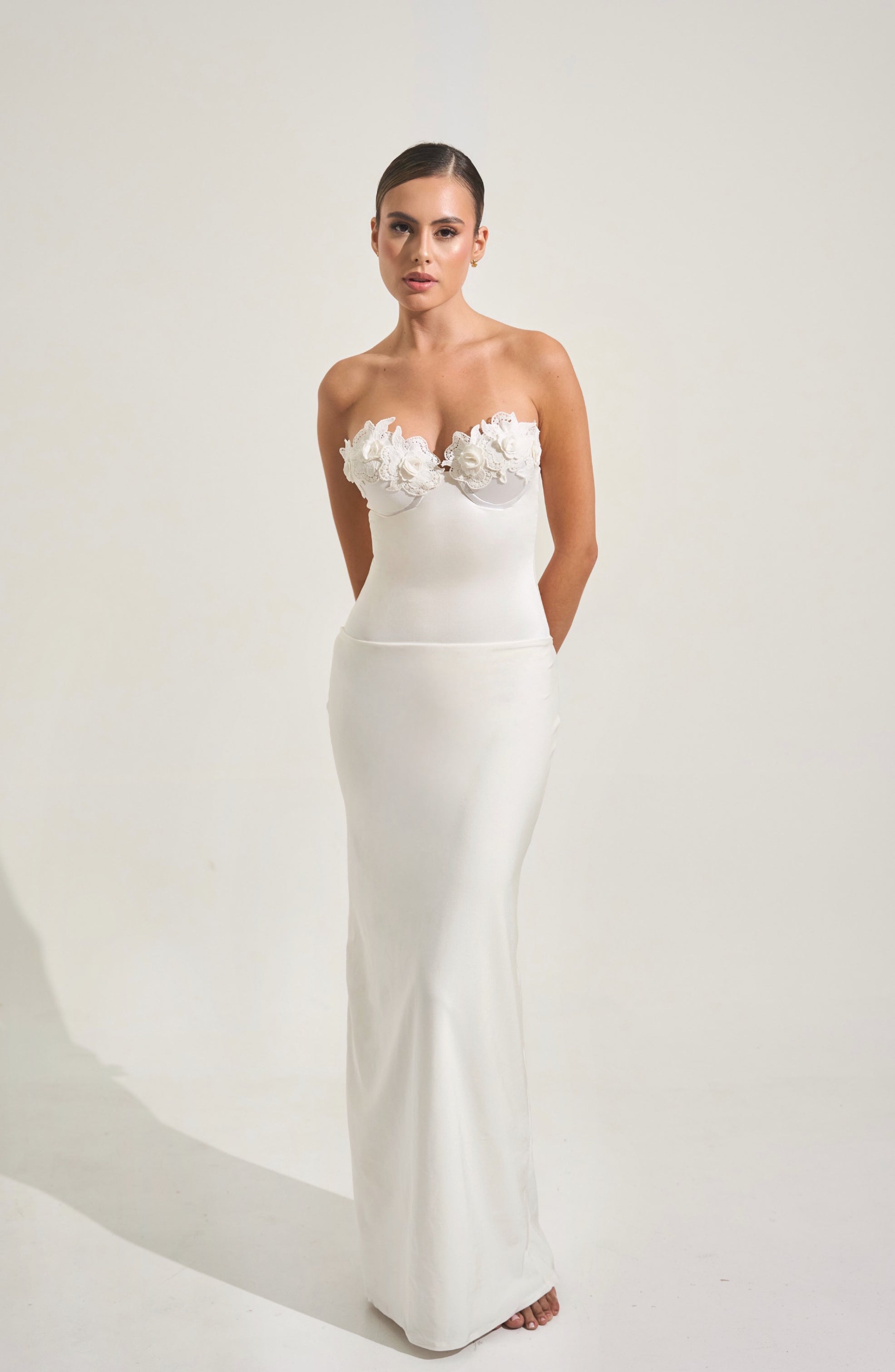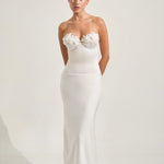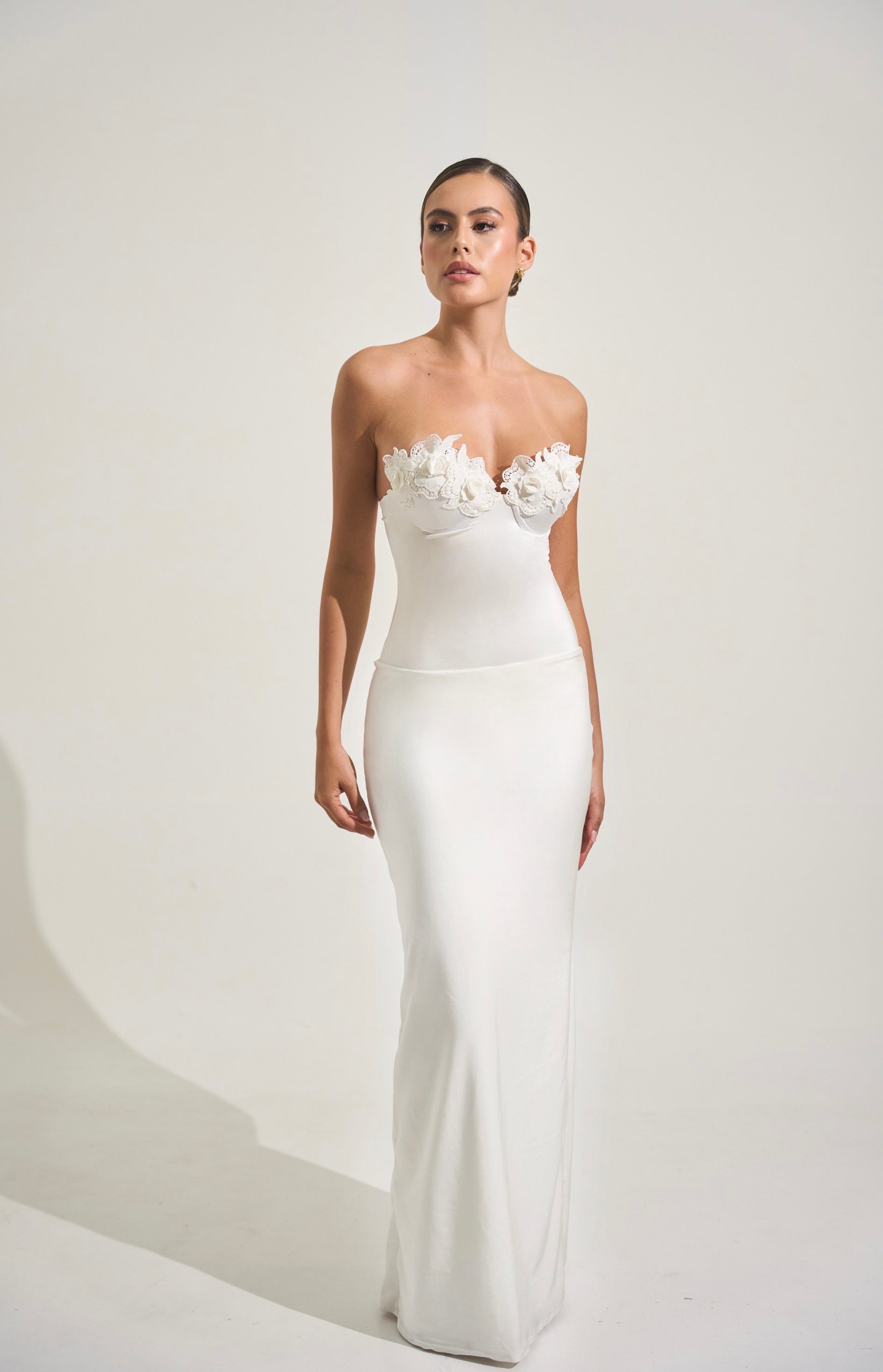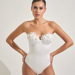 El Set Gardenia es la expresión perfecta de feminidad y romanticismo. Compuesto por un enterizo de baño y una falda a juego en tono marfil, se transforma en un vestido delicado y elegante cuando se usan juntos.