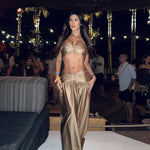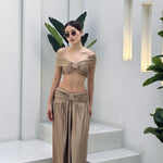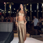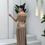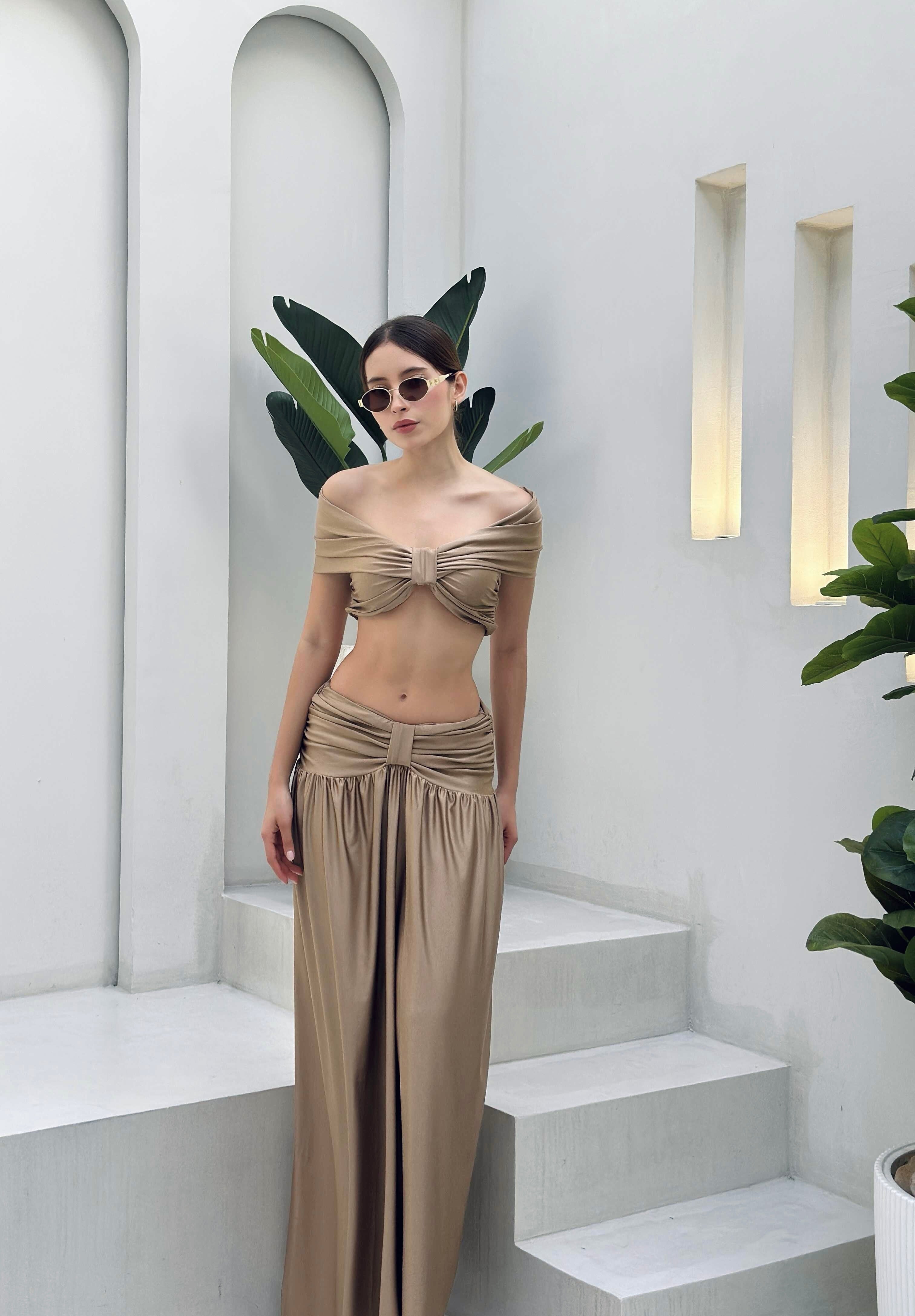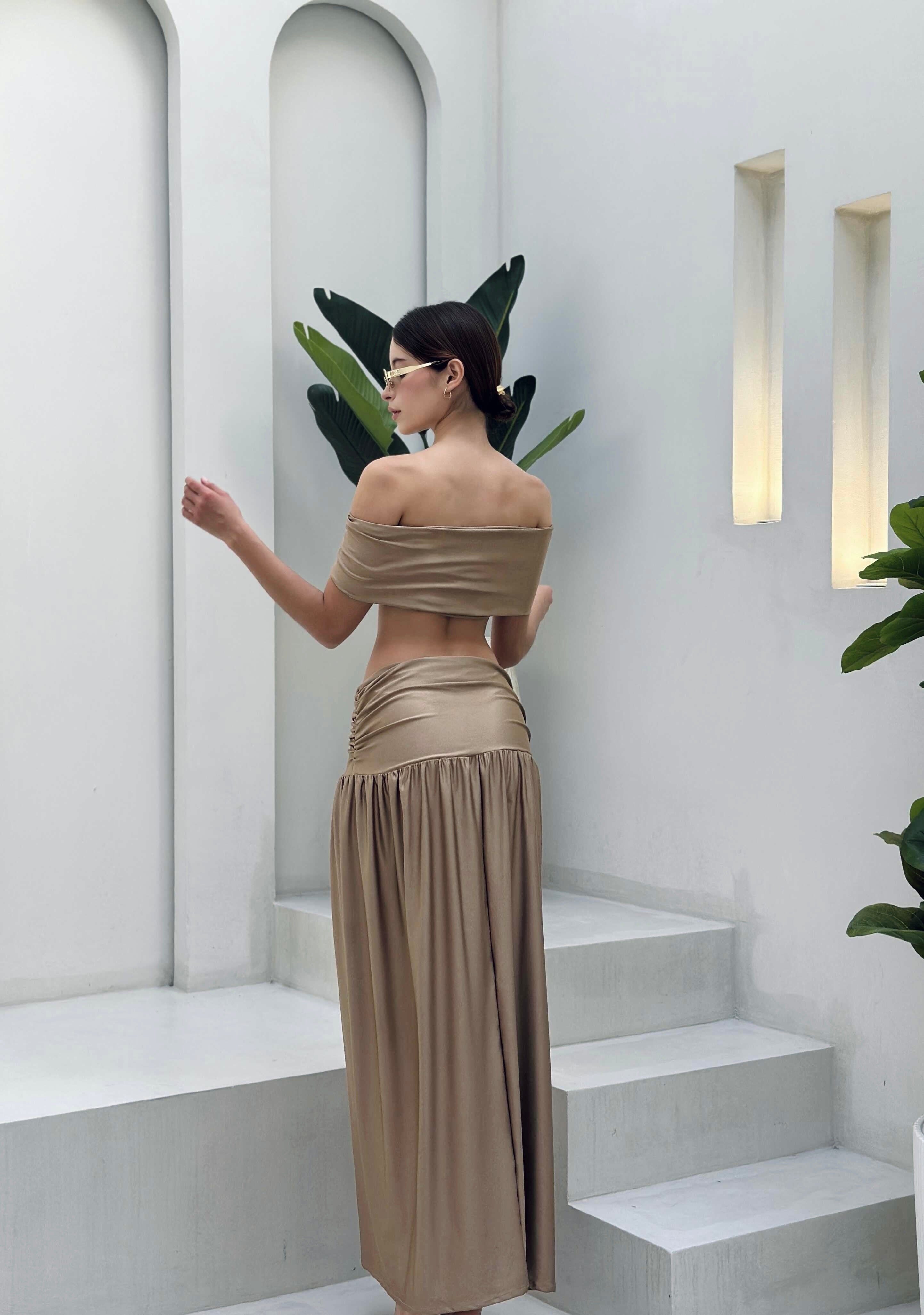 Set de dos piezas en tono arena, compuesto por top de hombros descubiertos y falda larga de talle alto.