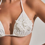 El Bikini Jazmín es una pieza delicada y atemporal que celebra la elegancia de lo artesanal. En tono marfil, destaca por sus flores en encaje colocadas a mano por talentosas artesanas, creando una textura única y llena de romanticismo.