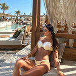 El top, con copa de realce y diseño romántico, enmarca la silueta con delicadeza, mientras que el panty graduable ofrece confort y ajuste ideal.