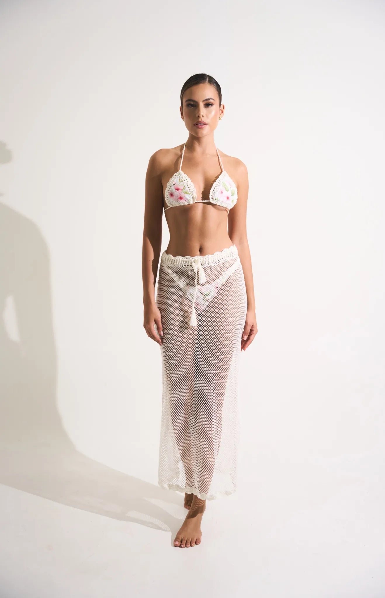 Su diseño integra una tela estampada digitalmente con flores rosadas, mientras que los bordes están tejidos a mano en crochet, creando una prenda única que destaca por su sofisticación y estilo.