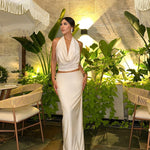 El Set Elena es la fusión perfecta de versatilidad y moda. Confeccionado en una tela con elongación que se adapta al cuerpo, este conjunto en tono marfil, el color tendencia del año, resalta la silueta con un ajuste impecable. Su diseño 2 en 1 permite usarlo como top y falda o transformarlo en un vestido sofisticado, ideal para cualquier ocasión.